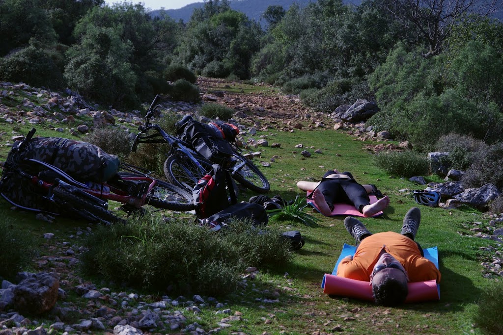 Во второй половине дня путь лежал через населенные пункты и апельсиновые рощи, но поскольку полиции в нашем походе и так было много, обносить сады мы не рискнули. В одной из деревушек меня угостили целым пакетом апельсин, апельсины обладают удивительным свойством поднимать настроение, наверное, из-за их солнечного цвета. К Олимпосу мы по традиции подъезжали затемно. На дороге к нам подъехала полиция, у меня мелькнула мысль - вдруг нашли паспорт!, Но они просто поинтересовались, что мы делаем. Да, действительно, что делает 6 человек с велосипедами на дороге – это загадка, ответ «едем в Олимпос» их удовлетворил, и пожелав нам приятного вечера полиция удалилась. У поворота на Олимпос мы снова встретили этих же полицейских, на этот раз они не спрашивали что мы делаем, а подбодрили нас криками бисиклета go, go ! Стоянка была запланирована у подножия горы Химера, и по традиции ( не благодаря, а вопреки) проехав по развалинам ночного Олимпоса, преодолев песчаный пляж и реку в брод
