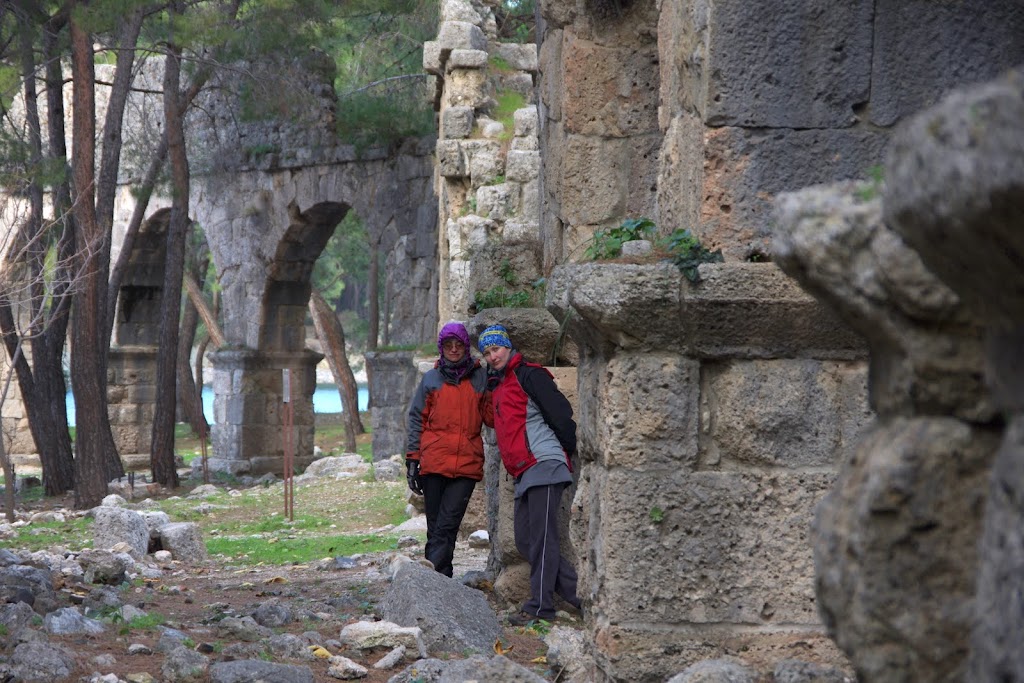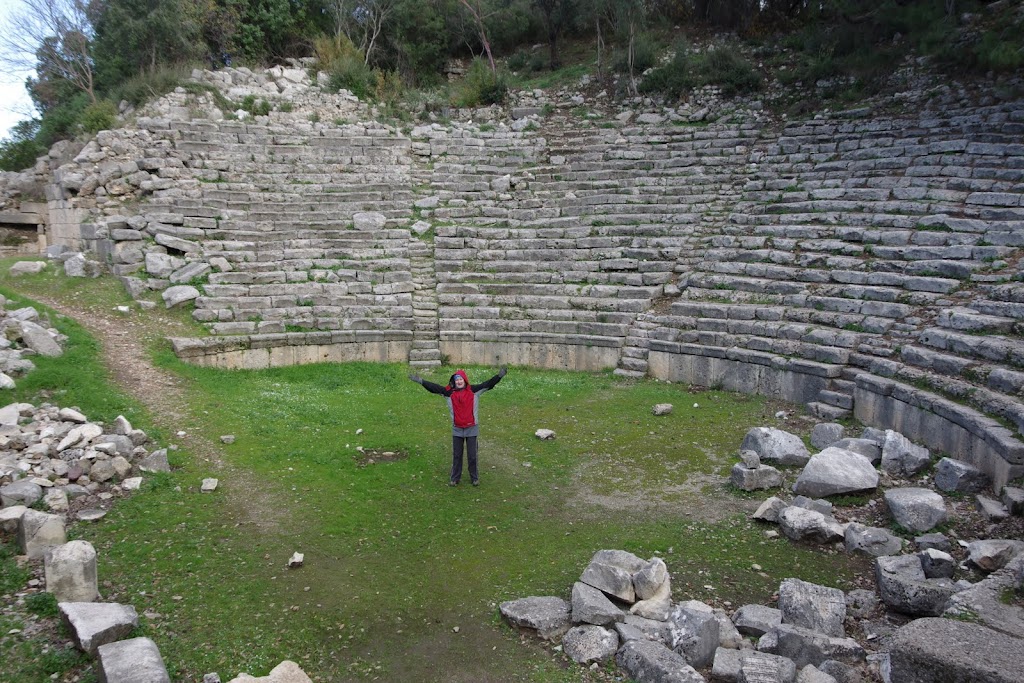 Спалось в эту ночь просто замечательно. Утром мимо лагеря раз пять пробежал австриец в странных трениках, когда он пробегал в шестой, я не выдержала и пригласила его: “cup of tea?”, на что он ответил “Why not?” и прибавил «хо-хо-хо»)) “My name is Aleksander!” хо-хо-хо и когда Юра лег на землю, чтобы сделать фото – “О, very professional!” хо-хо-хо)) короче прикольный дядька))). Собрали лагерь, обнесли апельсиновые деревья, заплатили 25 лир хозяину кемпинга, которого вызвала проходящая мимо женщина, так начался наш второй день похода. Солнышко пригревает, а вдалеке виднеются заснеженные вершины гор- красотища! Пару километров ехали, пару километров катили, пару километров пхачика - и мы у развалин древнего города Толос. Туристов совсем нет, в будочке, где берут деньги за вход -тоже никого нет, свободно осматриваем древний город и амфитеатр.