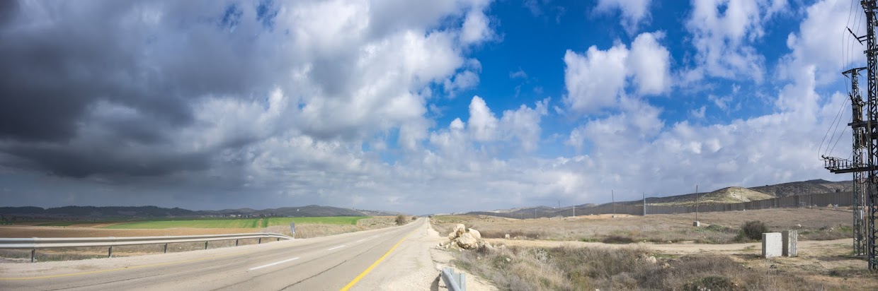 вышли на асфальт - дорога шла вдоль забора с Палестинской Автономией. мне показалось очень контрастным: слева - каменистые холмы и кое-где разбросанные домики. справа - такие же холмы, но с прозеленью в низинах, с копошащейся техникой и людьми.