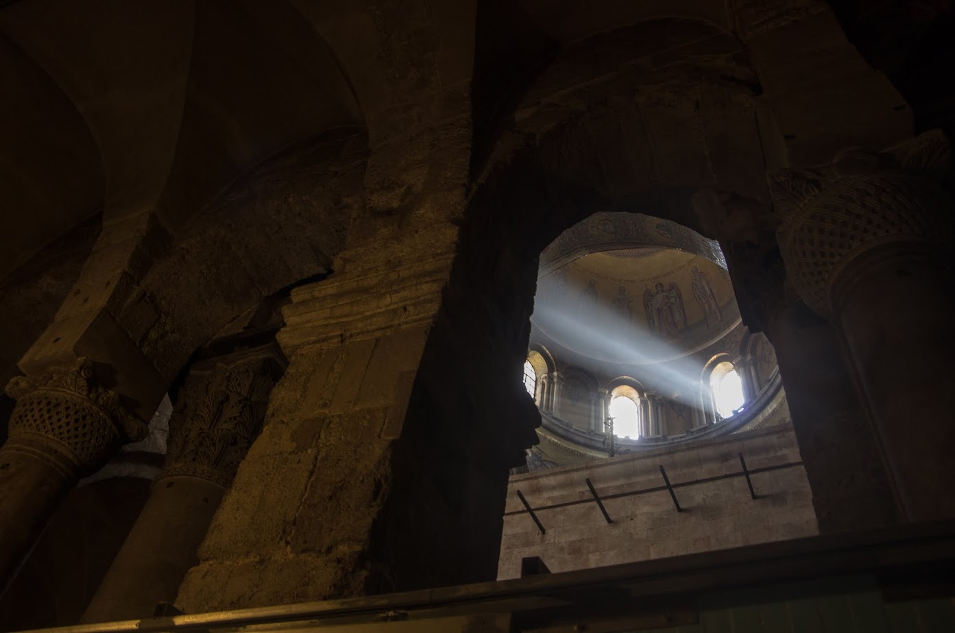 вход - врата смирения - метровый проем в западном крыле базилики. войти можно только согнувшись. побитая шашелем деревянная резьба врат, розовые колоны, мраморный пол, заграждения реставрации, заложенные окна (освещение - искусственное: свечи и электричество вперемешку), "окошки" мозаик. три службы...