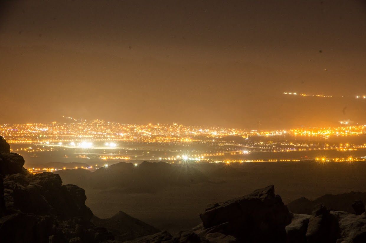 волшебный закат окрасил розовым противоположную (иорданскую) стену долины, сумерки стирали витиеватый узор скальных громад, оставляя только внешний причудливый контур. миллионом огней светилась Акаба, а тени ловко маскировали дырки в скалах)).