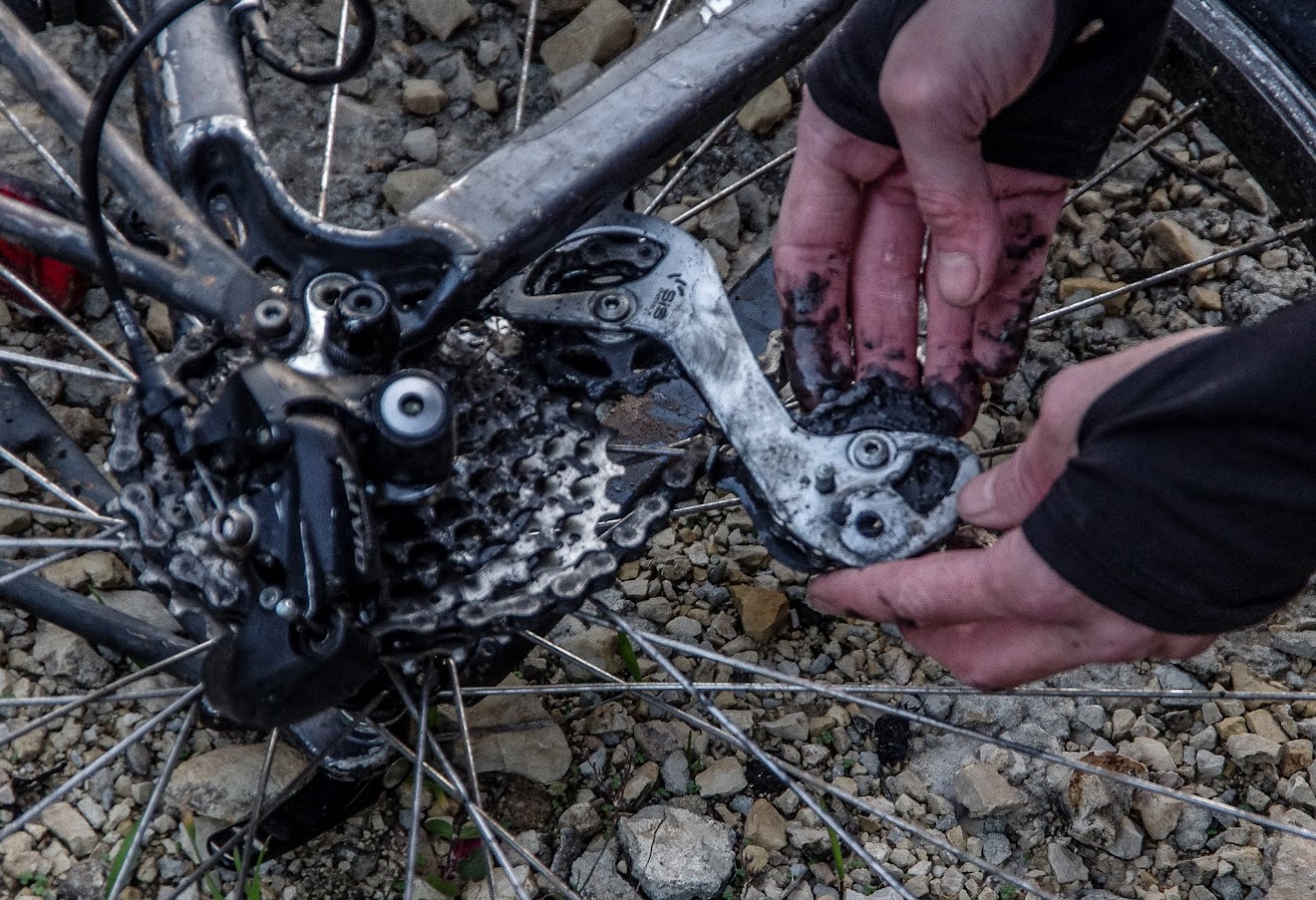 но лужи, слегка жидкая глина-грязь, и щебенка держали в тонусе. что-то клацнуло в желтыше. звук не понравился мне. дойдя в поводу до сухого, опасения стали явью - переклюк был сломан. не выдержал каменно-грязево-водных перепетий этого дня...